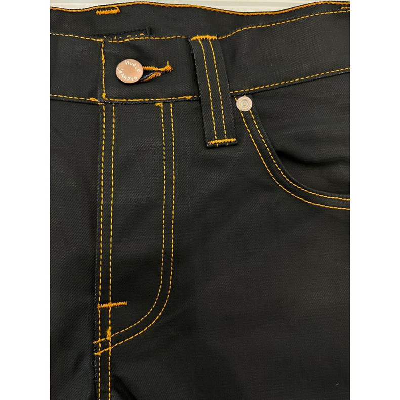Unleash your bold style with these sleek Nudie Jeans coated fabric pants, a true fusion of fashion and comfort. Tailored with attention to detail, they feature a 4-button closure ensuring a perfect fit. Amp up your look with the distinctive small front pocket design and classy rear welt pockets. The contrasting stitching adds a trendy edge, while the iconic logo patch signifies the mark of premium quality. An essential for the denim aficionado who dares to stand out.
