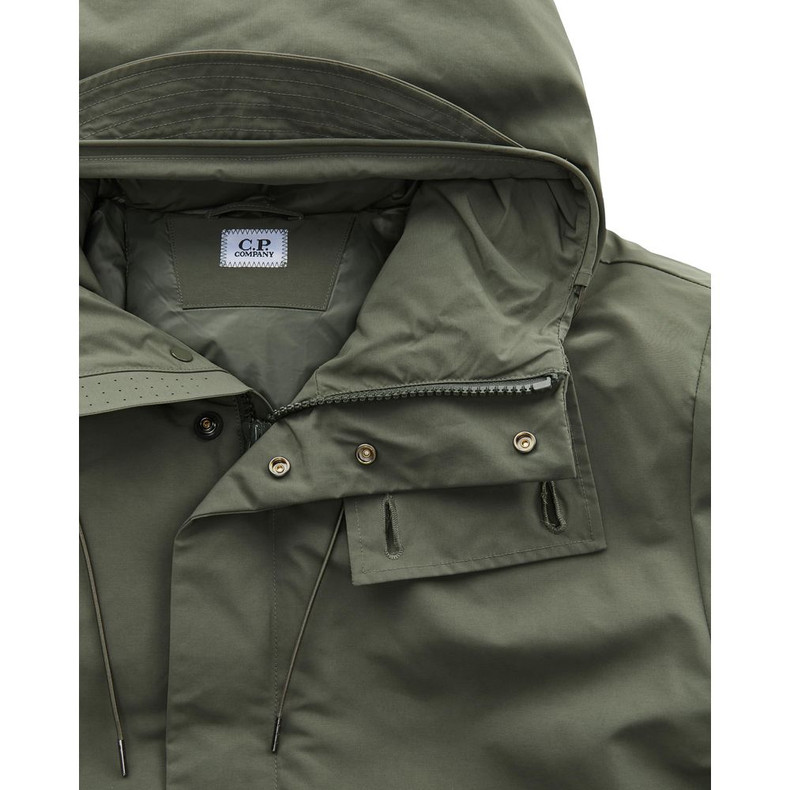 C.P. Company military green nylon long parka, zipper and snap closure, hood with visor and drawstring, front button pockets, duck down filling