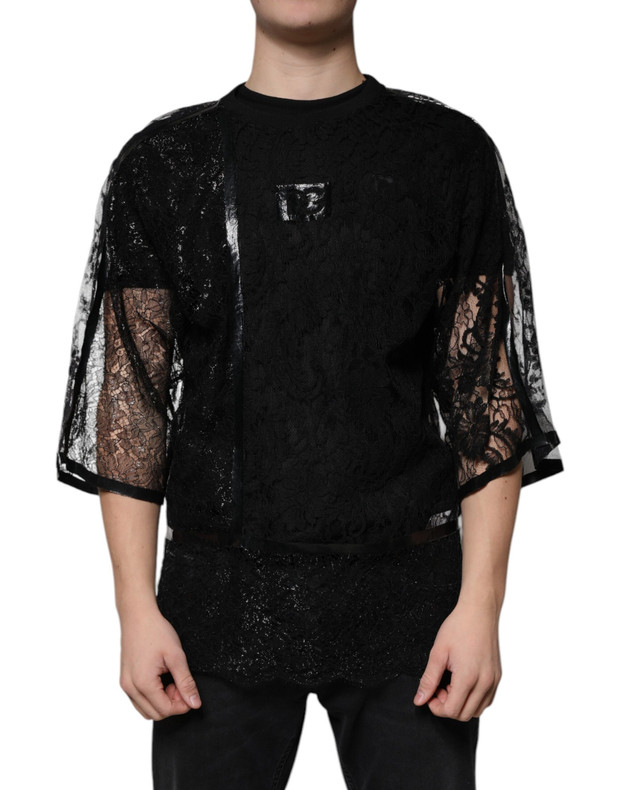 Dolce & Gabbana Black Nylon Floral Lace Crew Neck T-shirt