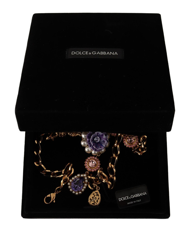 Adorn your neck with the epitome of luxury with this stunning Dolce & Gabbana gold crystal necklace. Flaunting a dazzling floral motif with a harmonious blend of pearls, crystals, and a touch of plastic for versatility, this statement charm necklace adds an air of opulence to any outfit. The rich gold hue complemented by pink and purple accents infuses your ensemble with a regal touch, while the secure lobster clasp ensures it graces your neckline with grace and comfort. Handcrafted with passion in Italy, this piece doesn’t just accessorize, it mesmerizes.
