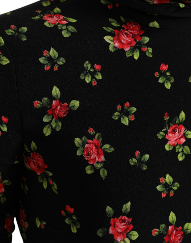 Indulge in the epitome of Italian luxury with this stunning Dolce & Gabbana long sleeve turtle neck top. A perfect blend of high-end style and comfort, this top is highlighted by a captivating multicolored floral print set against a classic black background. Crafted from sumptuous silk with a touch of elastane for a sleek fit, it features a chic turtle neck and drawstring detailed long sleeves. A discreet back zipper ensures a seamless closure, while the subtle logo detail adds a mark of authenticity. Designed and made in Italy, this blouse is a testament to exquisite craftsmanship.
