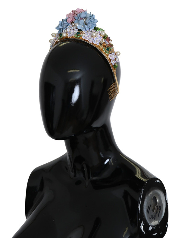 Indulge in the epitome of luxury with this Dolce & Gabbana crystal diadem tiara, brand new with tags and part of the exclusive MainLine Collection. Adorned with a lavish blend of crystals, pearls, and flower appliques, this stunning piece is a testament to intricate craftsmanship and Italian elegance. Perfect for adding a touch of regal glamour to any ensemble. The radiant combination of gold, purple, pink, and green hues complements a multitude of styles and occasions.