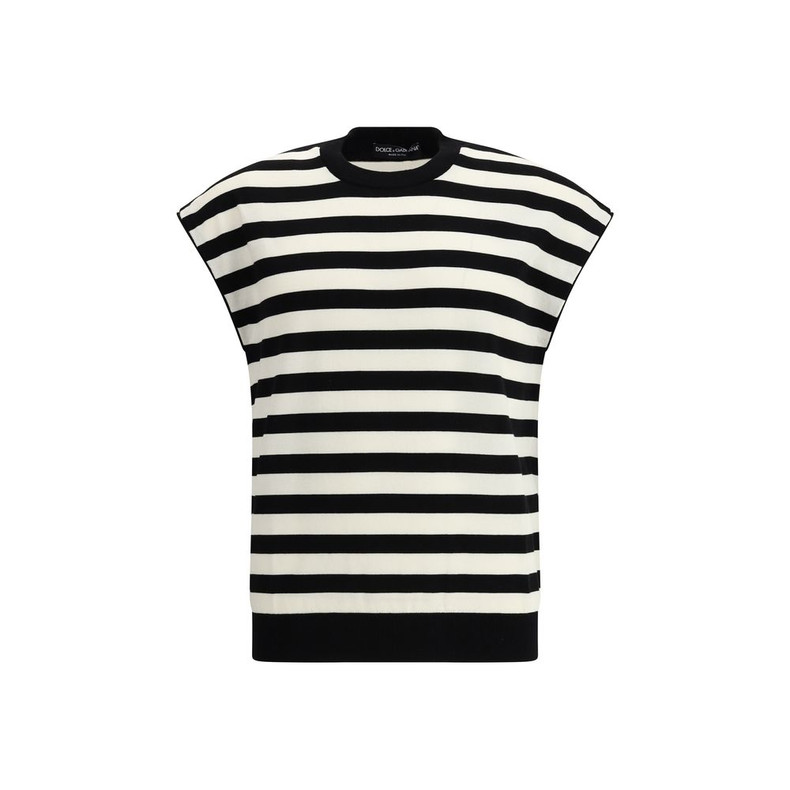 The Dolce&Gabbana striped knit Vest is a versatile and refined piece that adds a touch of elegance to the casual wardrobe. The ribbed crew neck and ribbed hem ensure a comfortable and defined fit, while the classic and dynamic striped pattern enriches the design with an interesting visual element. Perfect to wear over a shirt or t-shirt, this vest is ideal for creating a sophisticated yet informal look.