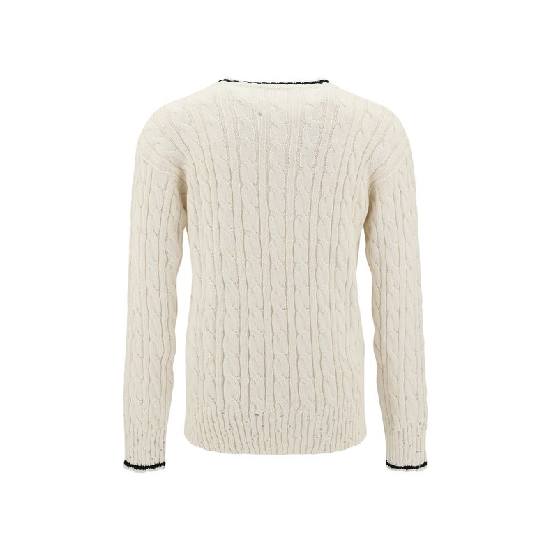 Marni’s cotton Sweater is a stylish and versatile piece perfect for those seeking a refined yet casual look. Featuring a V-shaped front drape, which adds a touch of originality, the sweater has ribbed cuffs and a high ribbed hem, which help define a clean, modern silhouette. The cable-knit weave gives the garment an interesting texture, adding depth and sophisticated visual detail.