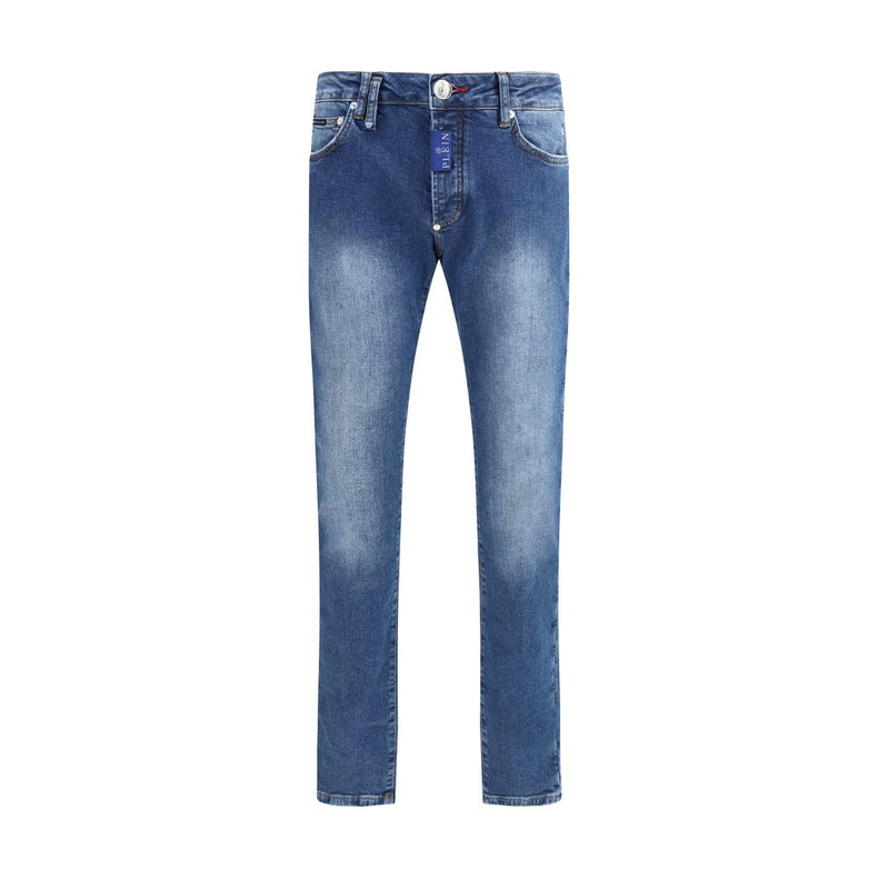 Philipp Plein’s cotton Jeans are a bold, modern garment made from high-quality cotton. They feature a straight five-pocket style that offers a straight and comfortable fit, perfect for a casual and versatile look. The front button closure lends a distinctive touch, while belt loops on the waistband allow you to customize the fit. On the back, the iconic logo patch stands out, while on the front we find an iconic monogram patch, adding a detail of luxury and recognition to the design.