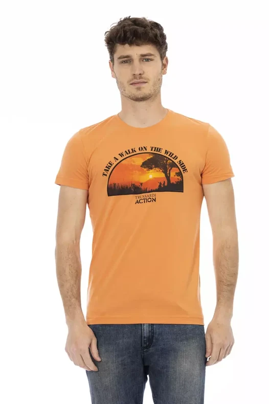 Elevate your wardrobe with the effortlessly chic Trussardi Action short sleeve T-shirt. This orange-hued staple features a striking front print that embodies the bold and trendy spirit. Crafted with a blend of cotton and viscose for ultimate comfort and breathability, this tee is a timeless addition that resonates with the Trussardi Action legacy of luxury. Perfect for the modern man who seeks style without compromising on quality.
