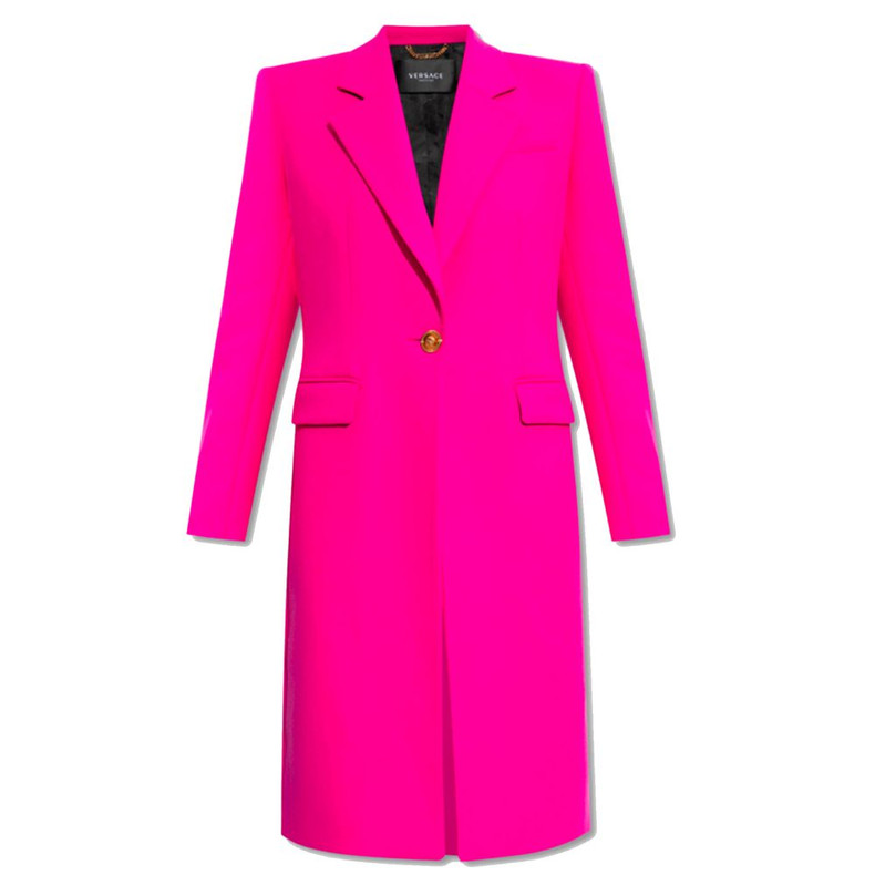 Versace wool long coat, fuchsia color, buttons with house logo, two-pocket design. Made in Italy
